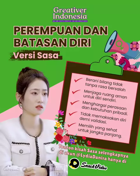 perempuan berani itu tahu kapan harus berkata “cukup”. Lihat gimana Sasa menjaga batasannya, tonton sekarang di Snack Video akun @LydiaDanira 🎬 #greativer #dubbing #voiceover #dracin #ramadhan