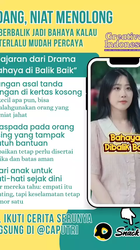 Dari cerita “Bahaya di Balik Baik”, kita belajar satu hal penting. nggak semua yang tampak baik, tidak berbahaya. Yuk tonton kisah lengkapnya di akun @Caputri di Snack Video, dijamin bikin kamu mikir dua kali soal “kebaikan”. 🎬 #greativer #promosi #kreator #karya #toleransi #contentcreator #jasa #dubbing #dubber #voiceover #translator #acting #suara #drama #fyp #viral #tips #trick