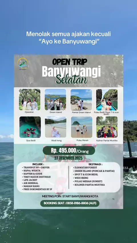 Promo Akhir Tahun explore Banyuwangi Selatan✨ Start from 495k aja kalian bisa explore destinasi wisata yang hits di Banyuwangi Selatan lohh!!! • Djawatan Forest • Green Island • Pulau Bedil • Wedi Ireng • Pantai Mustika (Kuliner) • Pulau Merah Catet tanggalnya ya 27 Desember 2025 Yuk amanin seatnya🙌🏻 Booking : 085881868806 ~Bestie Travelling-mu di Banyuwangi~#banyuwangi#explorebanyuwangi#greenisland#djawatan#pulaubedil