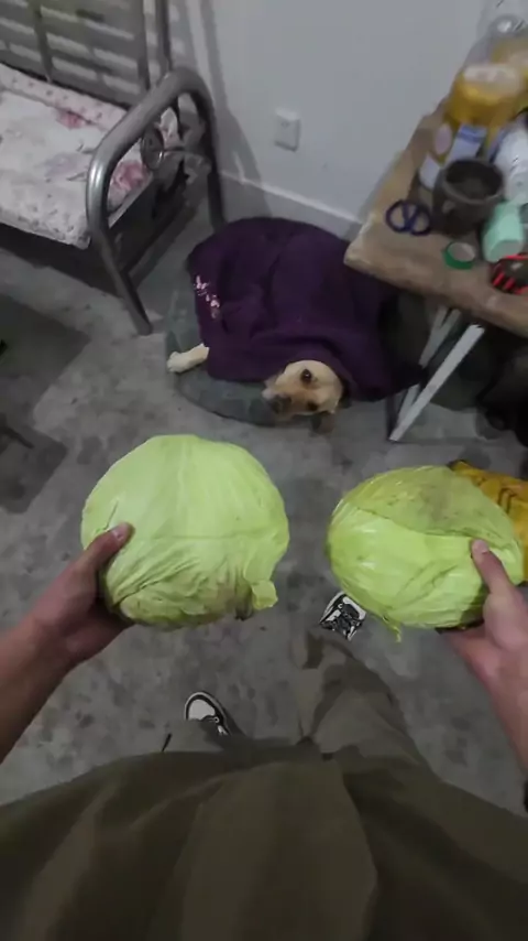 It’s getting cold; time to get a cabbage for the dog.#dogs