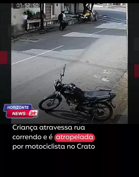QUESTÃO DE SEGUNDOS Uma criança foi atropelada por um motociclista no município de Crato, no Ceará, ao atravessar a rua correndo. A vítima estava junto da mãe quando o acidente aconteceu. O atropelamento foi registrado por uma câmera de videomonitoramento, que mostra quando a criança, junto da mãe, se prepara para atravessar a rua. Por um momento, a criança corre em direção à via e é atingida por uma motocicleta. A mãe, ao ver a situação de sua filha, entra em desespero. Em certo momento, ela