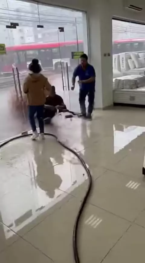 Homem invade loja de colchões com uma Mangueira Vap, e suja tudo! 😱 #viralvideo