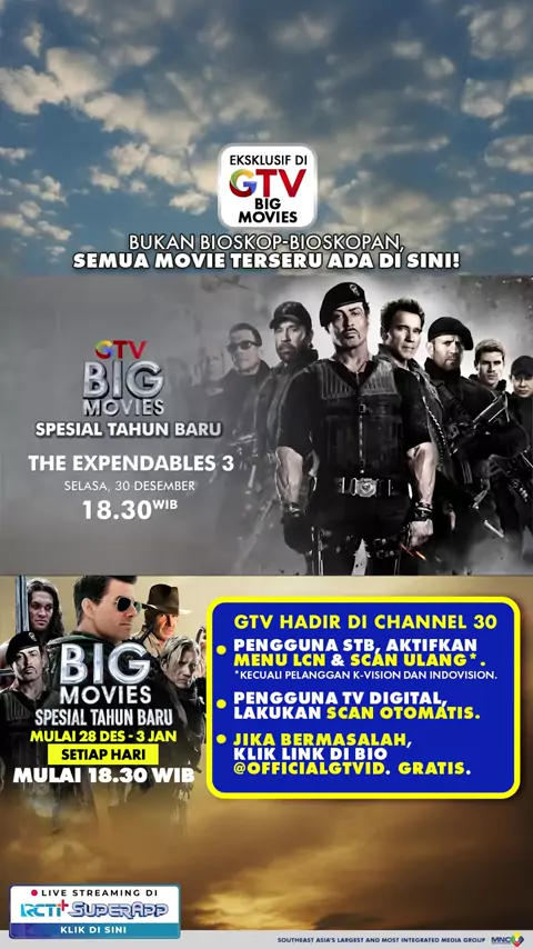 💣🔥 AKSI FULL TEAM, TANPA AMPUN! 🔥💣 Bukan bioskop-bioskopan, semua movie terseru ada di sini cuma di GTV BIG MOVIES Special Tahun Baru 💥 🎬 THE EXPENDABLES 3 🗓️ Selasa, 30 Desember ⏰ 18.30 WIB Siap-siap lihat aksi legenda bersatu dalam satu misi mematikan! 🍿😎 GTV Hadir di CHANNEL 30, ikuti cara mudahnya: • Aktifkan LCN lalu scan ulang STB Kamu • Scan otomatis TV Digital #JagonyaFilm #BigMoviesGTV #GTV