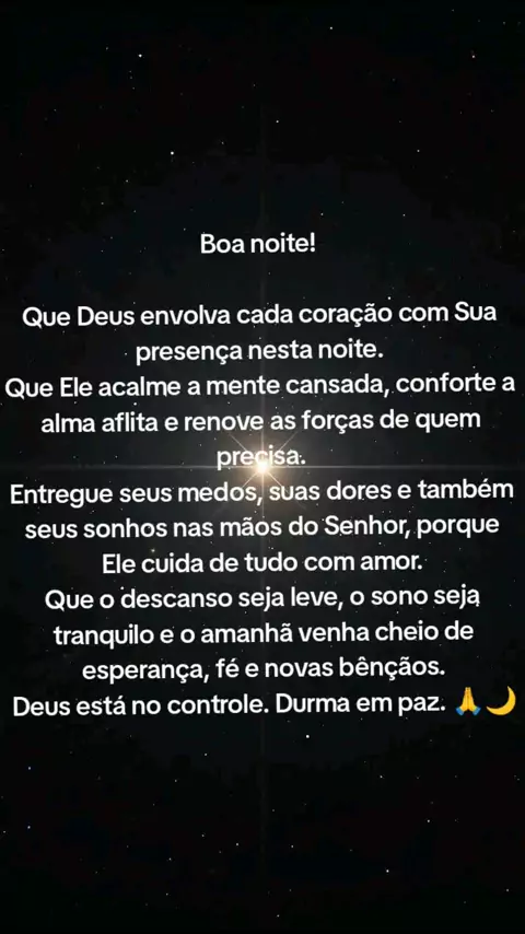 A mensagem deseja uma boa noite transmitindo paz, fé e confiança em Deus. Ela lembra que Deus está presente, cuidando das pessoas mesmo nos momentos de cansaço, medo ou preocupação. O texto convida a entregar as dificuldades e os sonhos a Deus, reforçando que Ele acalma o coração, renova as forças e traz esperança para um novo dia. O principal significado é incentivar o descanso tranquilo, a confiança no cuidado divino e a certeza de que Deus está no controle de tudo. #Mensagem #viraliza #Gratid