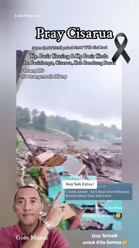 STAY SAFE EXTRA Kawan !😔🙏 Waspada & Hati-hati Point 1 @ᴵⁿᵈᶦᵍᵒPrekognision, @ᴵⁿᵈᶦᵍᵒPrekognision,dan @ᴵⁿᵈᶦᵍᵒPrekognision 🙏 Polisi menyatakan bencana longsor disertai banjir bandang yang menerjang Kecamatan Cisarua, Kabupaten Bandung Barat, mengakibatkan tujuh orang meninggal dunia, sementara 114 warga lainnya masih dalam proses pencarian. Kapolsek Cisarua A. Y. Yogaswara mengatakan peristiwa tersebut terjadi pada Sabtu dini hari sekitar pukul 03.00 WIB, diawali suara gemuruh keras yang terdeng...