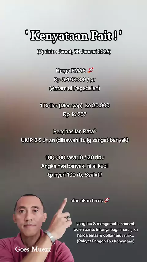 Wis Ngeriii.. Kawan !😖 Kuat²buat kalian semua ya.. menghadapi kenyataan tak seindah ekspektasi.. 🙏 Harga emas Antam hari ini, Jumat (30/1/2026) di Pegadaian kembali mengalami kenaikan dibandingkan perdagangan sebelumnya. Kenaikan terjadi baik pada harga jual maupun harga buyback emas Antam di seluruh ukuran. Berdasarkan data pembaruan harga di Galeri 24 Pegadaian, harga emas Antam hari ini ukuran 1 gram dipatok Rp 3.485.000, naik Rp 181.000 dari sebelumnya Rp 3.304.000. Sementara harga buybac...