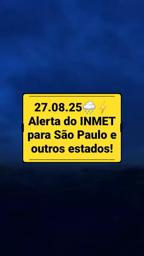 27.08.25 🌧️⚡ Alerta do INMET para São Paulo e outros estados! Chuva intensa, rajadas de vento e até possibilidade de granizo. O aviso segue até quarta-feira de manhã. 🚨 Atenção redobrada, população! 👇 E aí, como está o tempo na sua cidade? Conta pra gente! #PrevisãoDoTempo #ChuvaIntensa #AlertaINMET #SãoPaulo #ClimaBrasil