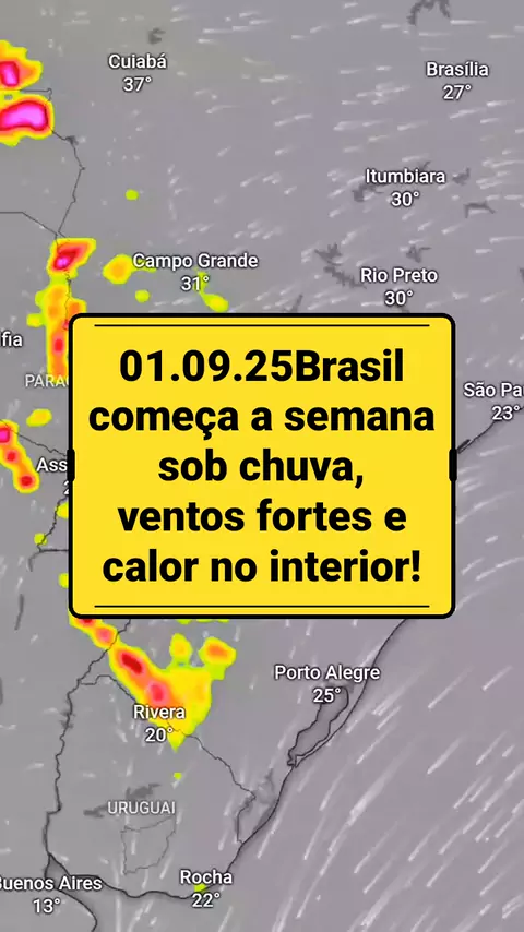 01.09.25 Brasil começa a semana sob chuva, ventos fortes e calor no interior! Instabilidades marcam o início da semana no Brasil. Chuvas no Sul e Sudeste, ventos de até cinquenta quilômetros por hora no Rio Grande do Sul e calor intenso no interior paulista, mineiro e no norte do Paraná. Confira a previsão completa! #PrevisãoDoTempo #TempoNoBrasil #ClimaHoje #Chuva #VentosFortes