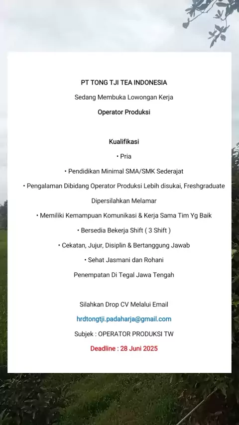 PT TONG TJI TEA INDONESIA Sedang Membuka Lowongan Kerja Untuk Posisi Operator Produksi #karir #lowongankerja