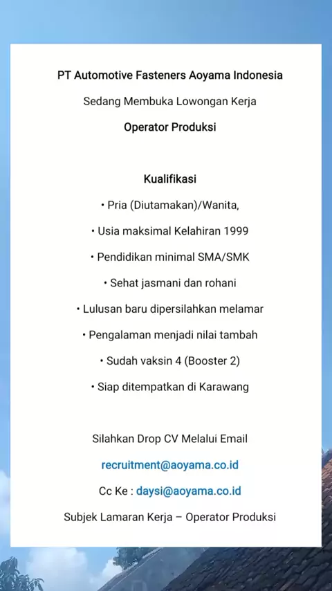 PT AUTOMOTIVE FASTENERS AOYAMA INDONESIA Membuka Lowongan Kerja Untuk Posisi ( Operator Produksi #karir #loker #Job #lowongankerja #kulipabrik
