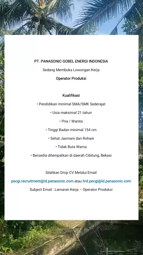 PT PANASONIC GOBEL ENERGI INDONESIA Membuka Lowongan Kerja Operator Produksi #karir #loker #Job #lowongankerja