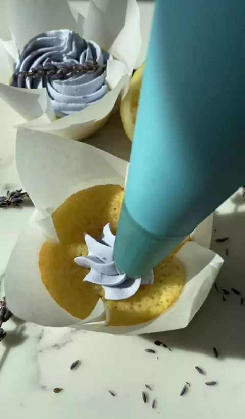 Cupcakes de limão de lavanda [receita ligada na minha bio] Cupcakes de limão úmidos e zingy cobertos com uma cobertura de creme de queijo de lavanda! # lemoncupcake # lavender # lemonlavender # lemon # easydessert # dessertrecipe