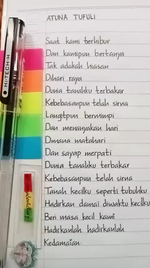 ATUNA TUFULI Versi Bahasa Indonesia PULPEN HI TECH H link produk ada di bio @RAHMADANI no. 71 kategori ALAT TULIS 🌈#atunatufuli😥#atunatufuli#rahmadanidiary#liriklagu#handwritting#palestine🇵🇸#palestina_indonesia#palestina❤️#tulisantangan