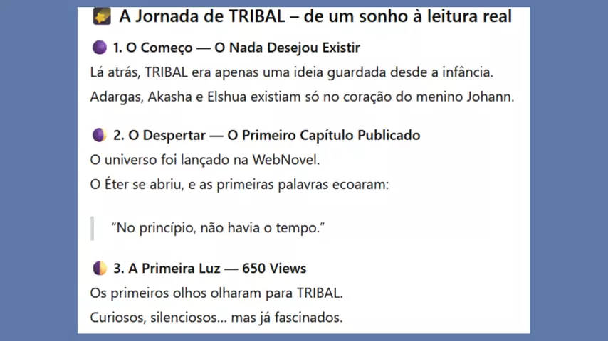 🌌 TRIBAL — Uma saga onde o divino e o humano se confundem. Do Nada, nasceu o Desejo. Do Desejo, o Universo. E entre as estrelas… a jornada de Adargas, Akasha, Elshua e Tribal. Uma história sobre criação, queda e redenção — onde cada palavra carrega um eco de eternidade. ✨ Leia agora na WebNovel, Amazon e Wattpad. ✍ Autor: J. T. T. Adargas #criançafeliz #diadonordestino #2025internationalshortvideocompetition #japaoxbrasil #leitura