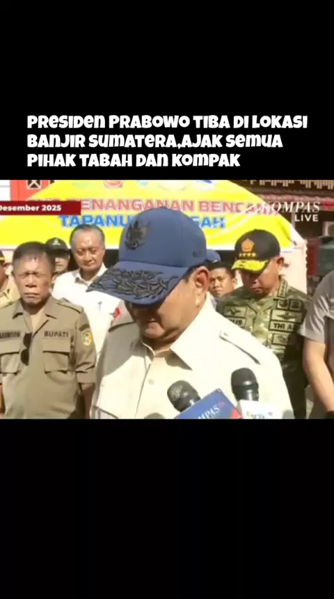 Presiden Prabowo Tiba di Lokasi Banjir Sumatera, Ajak Semua Pihak Tabah dan kompak Presiden Prabowo Subianto memberi keterangan kepada awak media di tengah kegiatan meninjau lokasi bencana banjir dan longsor di Tapanuli. Presiden Prabowo Subianto meninjau lokasi banjir dan longsor di Sumatera Utara (Sumut) hari ini, Senin (1/12/2025).  Presiden Prabowo tiba di Posko Penanganan Bencana Tapanuli Tengah, Sumut, pukul 08.41 WIB.  Di tengah kegiatan peninjauan itu, Presiden memberikan sejumlah keter...