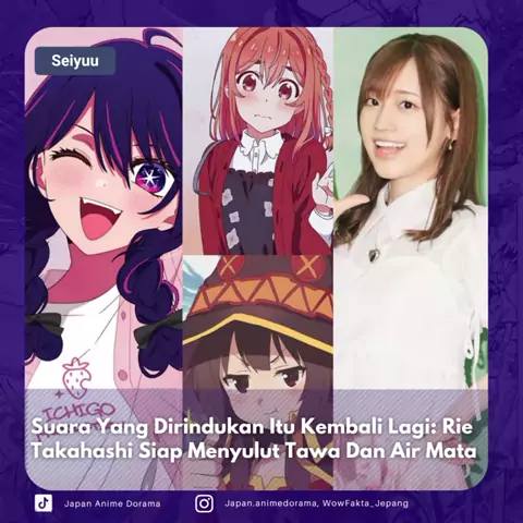 [📰#JAD_WartaSeiyuu] Setelah menjalani operasi pita suara dan rehat selama satu bulan sejak pengumuman pada 3 April lalu, seiyuu Rie Takahashi resmi kembali beraktivitas di dunia hiburan. Kabar bahagia ini ia sampaikan langsung melalui unggahan di akun X (sebelumnya Twitter), yang sontak disambut hangat oleh para penggemarnya. Dalam pesannya, Takahashi mengungkapkan rasa terima kasihnya kepada semua pihak yang mendukung masa pemulihannya. “Terima kasih kepada semua yang mengirim pesan dan surat...