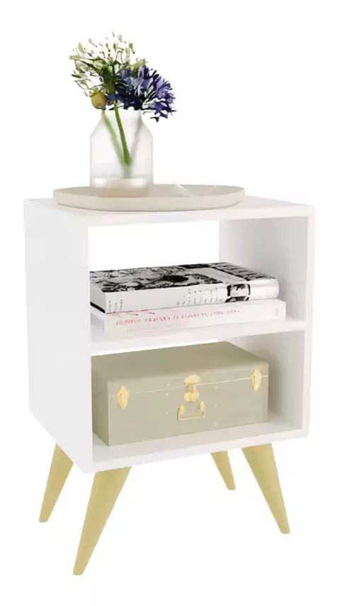 Mesa de Cabeceira Retrô Compacta, Nicho para Quarto e Sala, Casal ou Solteiro, Palma, nas cores branca e preto #nicho #mesa #rack #criadomudo #ia