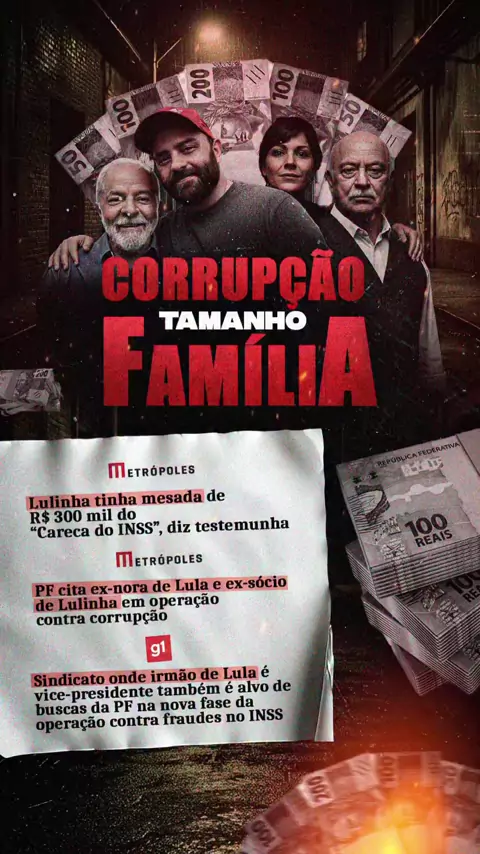 A nova fase da investigação do INSS, revelou algo que o Brasil já desconfiava: a fraude está cada vez mais perto da família de Lula. O vice-presidente do Sindnapi (entidade alvo da PF) é ninguém menos que Frei Chico, irmão do presidente, a mesma investigação já apontou mesada de R$ 300 mil para Lulinha, contratos suspeitos ligados ao ex-sócio do filho de Lula e até a ex-nora do petista envolvida em lobby e propina. #FraudedoINSS #desgovernoLula #rombo #forapt #LulaNaCadeia