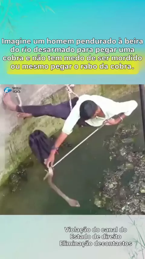 O homem pendurou-se à beira do rio desarmado para pegar a cobra. ele não tinha medo de ser mordido ou mesmo pegar a cauda da cobra.