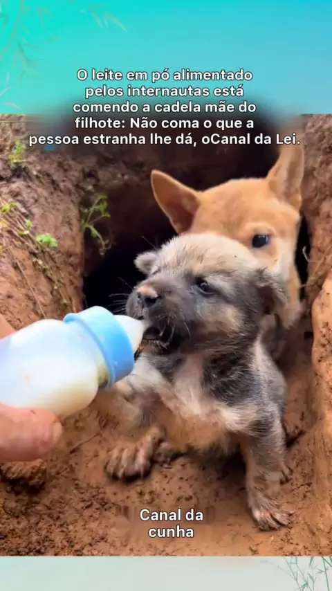 A cadela mãe não deixa os filhotes comerem o leite da pessoa.