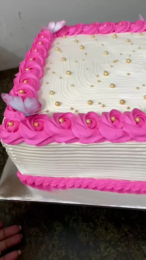 Bolo retangular de 80 fatias, aff tinha uma mosca perturbando querendo pousa no meu bolo chooo pra lá coisa ruim… enfim o bolo ficou espetacular o que acharam? #bolo #confeiteira #borboletas #Rosa #branco