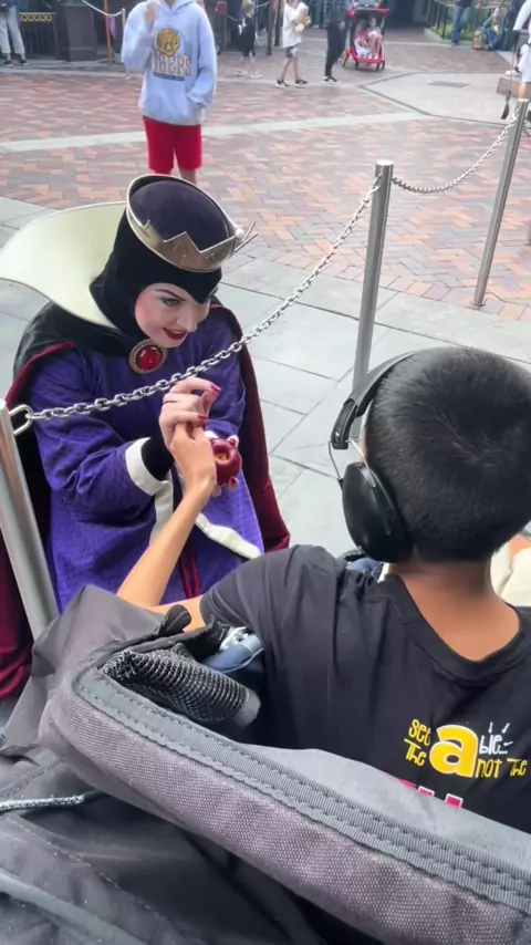 A "não tão" Rainha Má dizendo a Thomas que ele pode ser um porta-voz de sua maçã # autismo # autismoawareness # autismoaceitação # ASD # specialneeds # Disney # Disneyparks # Disneyland # disney # disney100 # Wendy # evilqueen # # page