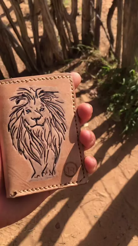 "Elegância e arte em cada detalhe! 🦁✨ Esta carteira de couro, feita com costura manual, traz o majestoso leão, simbolizando força e coragem. Perfeita para quem valoriza exclusividade e estilo. #ArteenCouro #Elegância #LeoInspiração"