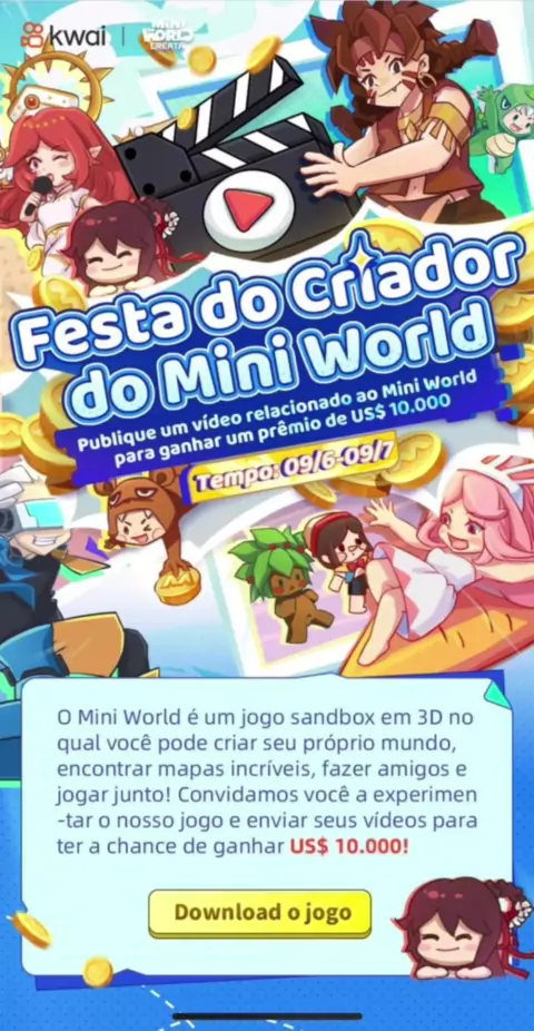 Basta postar vídeos e terá a chance de dividir o prêmio de $10.000🔥 Kwai e MiniWorld estão organizando uma nova campanha em conjunto. A duração da campanha é de 9 de junho a 9 de julho, com recompensas generosas e muitas formas de jogar #miniworld