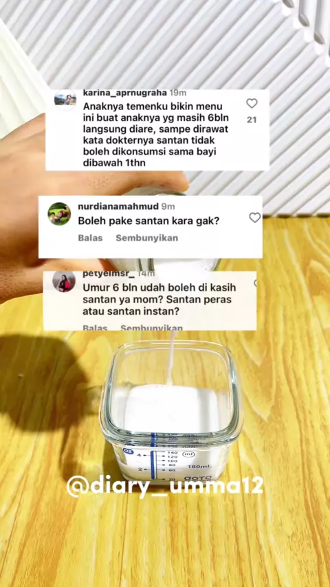 Jangan lupa save & follow @diary_umma12 untuk tips sharing dan menu mpasi lainnya Silahkan share kalau mam rasa videonya bermanfaat ya😊 🔸Selain mengandung lemak baik, santan juga diketahui mengandung beragam vitamin dan mineral kandungan gizi santan mentah dan kalengan: Kalori: 445 Air: 164,71 gram Protein: 4,57 gram Lemak: 48,21 gram Karbohidrat: 6,35 gram Kalsium: 41 miligram Potassium: 497 miligram Magnesium: 104 miligram Zat besi: 7,46 miligram Vitamin C: 2,30 miligram 📌Amankah Memberik...