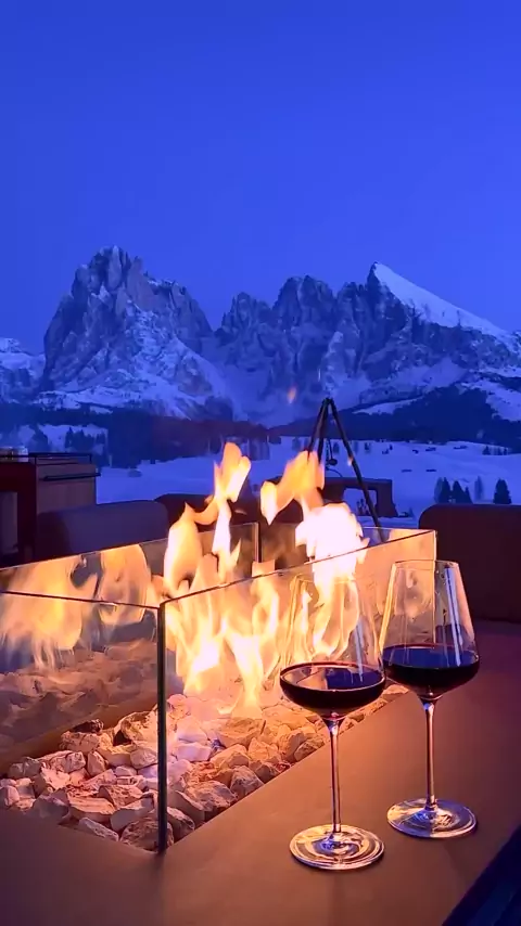 Tudo que eu queria nesse início de noite nesse sábado, vinho, uma bela fogueira e uma linda paisagem. #vinho #fogueira #Paisagem #neve #montanha