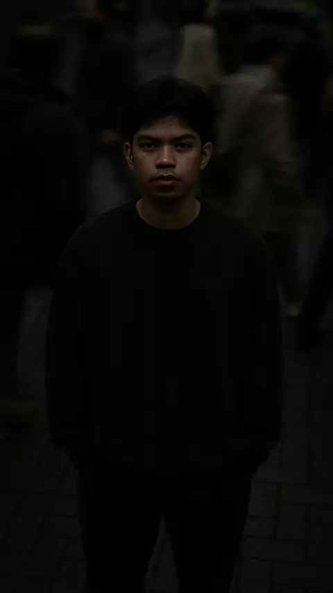 Foto sinematik dari atas yang menunjukkan saya berdiri diam di tepi jalan kota, mengenakan sweter besar berwarna gelap. Kerumunan yang kabur melintas di sekitar saya. Pencahayaan suram, tampilan film 35mm. kedalaman bidang dangkal, fokus tajam ke arah saya. Potret ransum 4:3