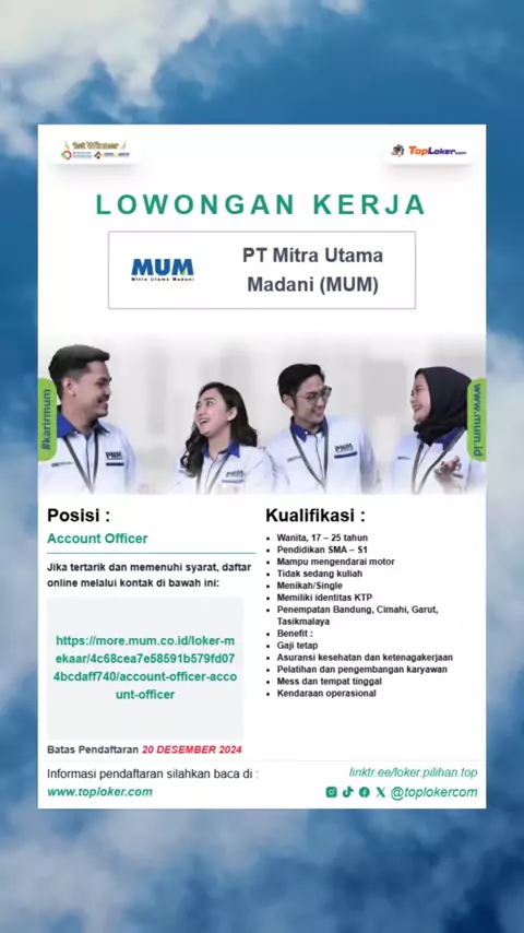 LOWONGAN KERJA PT.MITRA UTAMA MADANI 2024 info lowongan kerja selengkapnya kunjungi website resmi www.toploker.com#lowongankerja#infoloker#loker#mum#lokerjabodetabek