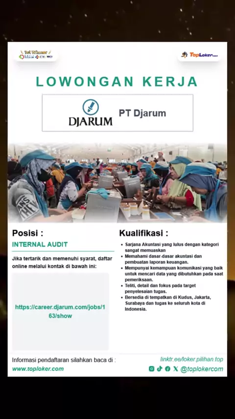 PT Djarum membuka loker Internal Audit. Send your cv ke link yang tersedia dipamflet | informasi pendaftaran selengkapnya silahkan kunjungi website kami www.toploker.com#lokerdjarum#djarum#lokeraudit#internalaudit#lokerkudus