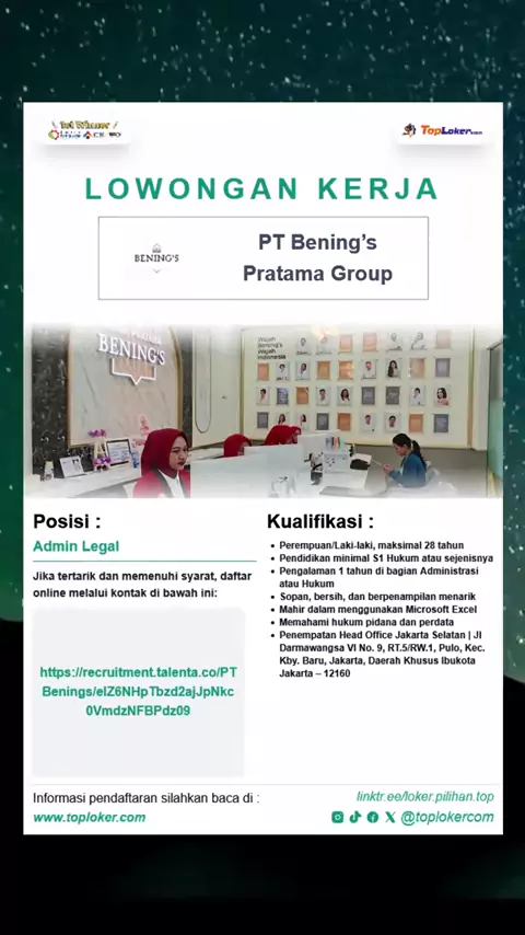 PT Bening's Pratama Group membuka loker Admin Legal. Send your cv ke link yang tersedia dipamflet | informasi pendaftaran selengkapnya silahkan kunjungi website kami www.toploker.com#lokerbenings#lokeradmin#adminlegal#klinikbening#beningpratamagroup