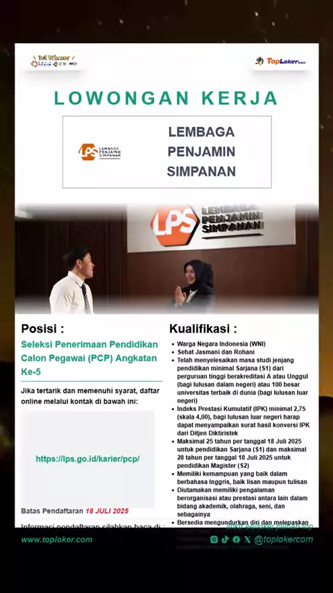 Lembaga Penjamin Simpanan membuka Seleksi Penerimaan Pendidikan Calon Pegawai (PCP) Angkatan ke-5. Send your cv ke link yang tersedia dipamflet | informasi pendaftaran selengkapnya silahkan kunjungi website kami www.toploker.com#lokerinternship#internship#LPS#lembagapenjaminsimpanan#lokerfreshgraduate#lokerterbaru##lokermagang#magang