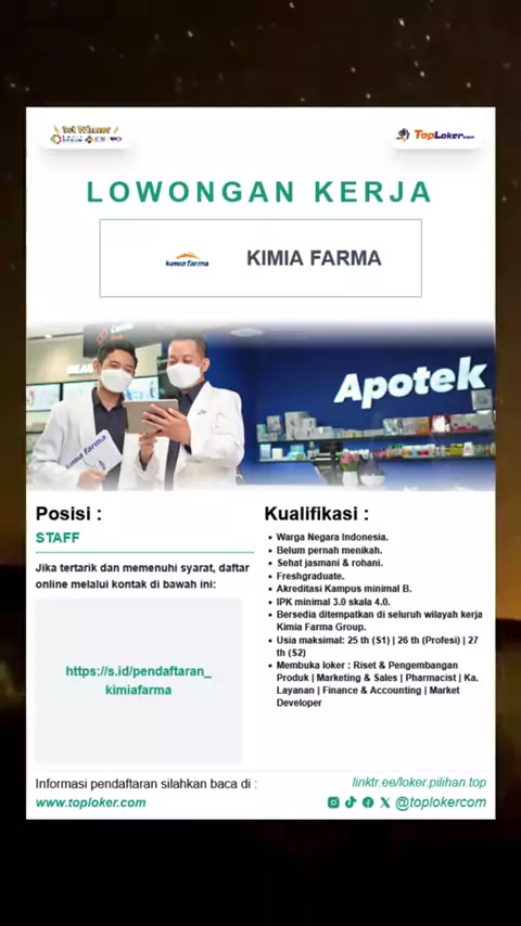 Kimia Farma membuka loker Riset & Pengembangan Produk | Marketing & Sales | Pharmacist | Ka. Layanan | Finance & Accounting | Market Developer. Send your cv ke link yang tersedia dipamflet | informasi pendaftaran selengkapnya silahkan kunjungi website kami www.toploker.com#lokerapoteker#lokersales#kimiafarma#finance#lokerakunting