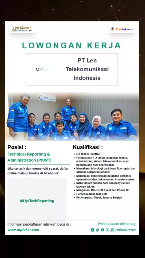 PT Len Telekomunikasi Indonesia membuka loker Technical Reporting & Administration (PKWT). Send your cv ke link yang tersedia dipamflet | informasi pendaftaran selengkapnya silahkan kunjungi website kami www.toploker.com#lokerteknisi#lokeradmin#administrasi#telekomunikasi