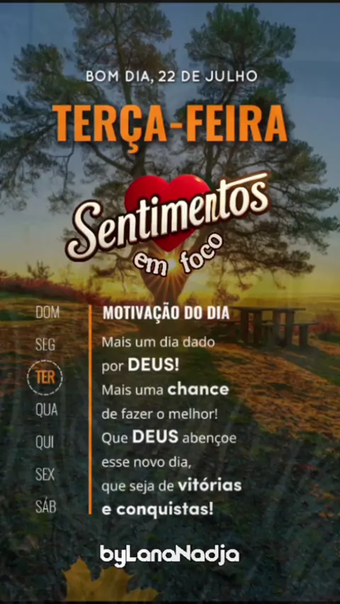 Bom dia... Que esta terça-feira brilhe como um raio de esperança em sua vida. Permita-se renovar cada pensamento com positividade e confiança, sentindo a força divina iluminar seus caminhos. Nos desafios, lembre-se: sua coragem é uma ponte para dias extraordinários e sua fé, uma chave para abrir portas de paz e realização. Hoje, entregue seus sonhos a Deus com gratidão e viva cada momento como única oportunidade de ser feliz. Que a sua terça seja inesquecível e abençoada! É o desejo de Lana Nadj