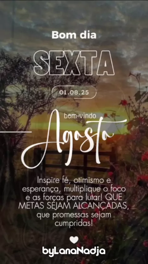 Bom dia... Bem-vindo Agosto, um mês para inspirar fé, otimismo e esperança. Multiplique o foco e as forças para lutar, que as metas sejam alcançadas e as promessas cumpridas. É o desejo de Lana Nadja . Siga e compartilhe o Canal Sentimentos em Foco : https://whatsapp.com/channel/0029Vb1vzbnJ93wMGNjDdc1z . Gratidão!