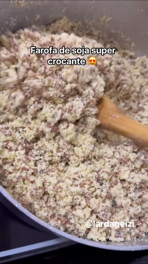 Farofa de soja super crocante. Ingredientes: 1 sachê de sopa de cebola ou creme de cebola, 200ml de óleo, 250g de manteiga ou margarina, 5 xicaras de farinha de mandioca, 400g de proteína de soja.