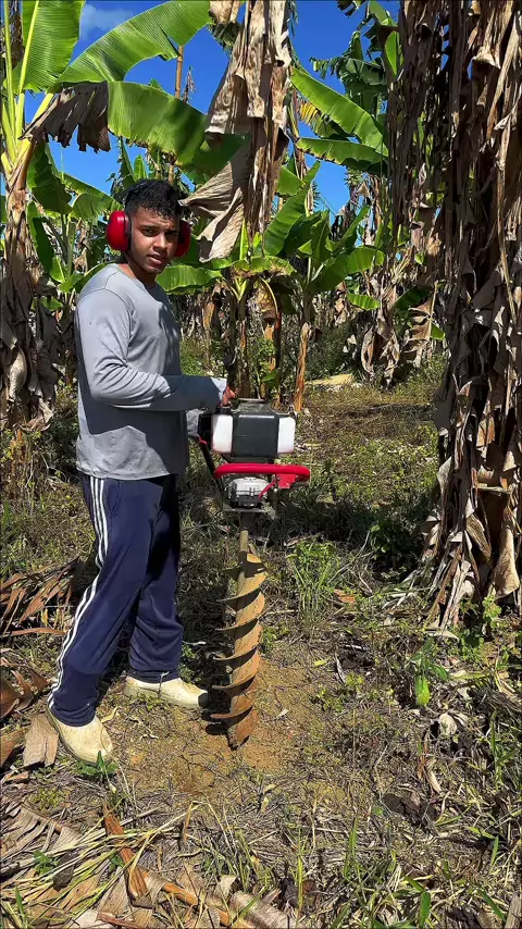 mostrando cavando buraco pra escorar banana da terra com uma cavadeira a gasolina