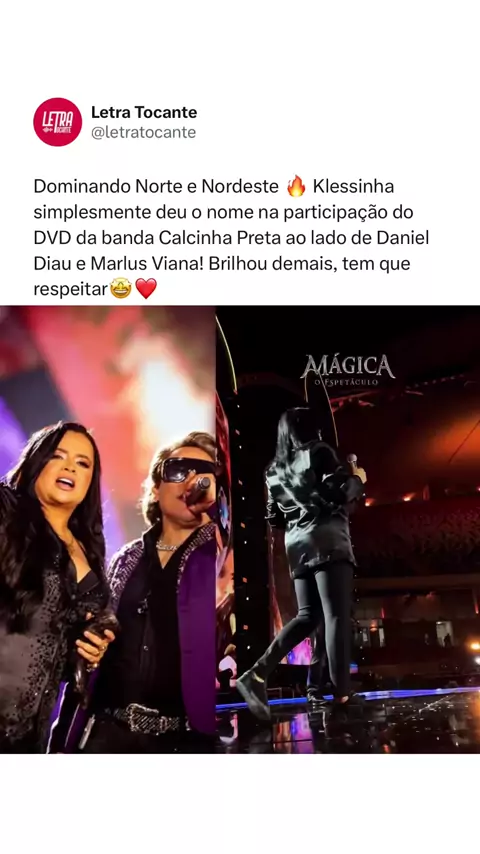 Klessinha viveu um dos seus momentos mais especiais ao subir ao palco com a banda Calcinha Preta ❤️ No DVD, gravado em Belém do Pará, ela brilhou em duas músicas e mostrou por que é uma das vozes que mais se destacam atualmente, levando sua identidade e presença para o Norte e Nordeste. Uma parceria que marca e emociona 🥹 - 🎙️ @klessinha | Via @linkprodutora - #klessinha #calcinhapreta #danieldiau #marlusviana
