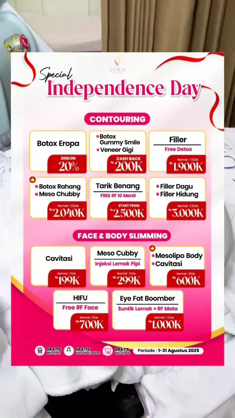 Spesial bulan kemerdekaan🎉 Kamu bisa dapatin banyak diskon treatment dari loris beauty clinic🥰 buruan datang sebelum kehabisan✨#indenpendenceday#diskon#promo#spesialkemerdekaanidonesia#GlowUp#glowingskin#botox#filler#laser#tarikbenang#skinbooster##lorisbeautyclinic#klinikkecantikan#klinikkecantikanjombang#lorisjombang