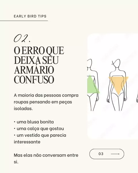 Um armário elegante não é cheio. Ele é conectado. Quando as peças conversam entre si, tudo muda. ✔ combinações ficam fáceis ✔ os looks parecem mais sofisticados ✔ você usa muito mais o que já tem A elegância está na estratégia do guarda-roupa, não na quantidade de roupas. Um armário inteligente, com peças versáteis, cria dezenas de combinações possíveis sem esforço. Isso é o que chamamos de armário estratégico ou armário cápsula elegante. Se você sente que tem muitas roupas, mas sempre a s