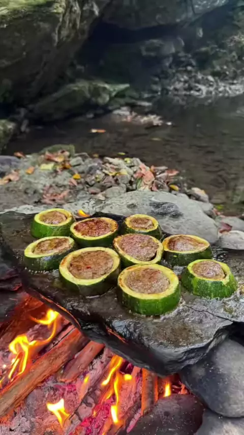 Cooking zucchini ring kebab on nature stone #asmrcooking#outdoorcooking#Recipe#leon#naturecooking#cookinger#camping#food#asmrvideo#kebab