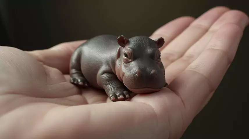 Mini hipopótamo de 8 cm, com pele cinza brilhante e aspecto fofo, sentado na palma da mão. #hipopotamo