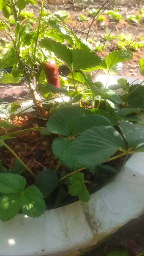#plantação #horta🍂⛏👈 #🌷🍅🍅 #hortaorganica pimentão verde e morango 🍓 em vaso 😋
