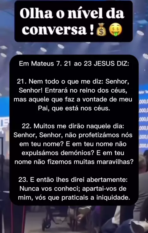 21 Nem todo o que me diz: Senhor, Senhor! Entrará no reino dos céus, mas aquele que faz a vontade de meu Pai, que está nos céus. 22 Muitos me dirão naquele dia: Senhor, Senhor, não profetizámos nós em teu nome? E em teu nome não expulsámos demónios? E em teu nome não fizemos muitas maravilhas? 23 E então lhes direi abertamente: Nunca vos conheci; apartai-vos de mim, vós que praticais a iniquidade.#acontecenasigrejas #gospel #mundogospel #sojesus #qvergonha