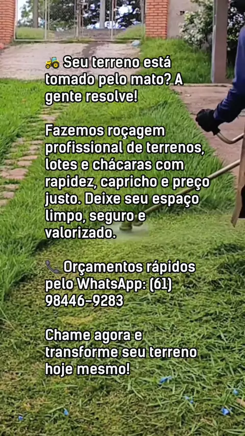 🚜 Seu terreno está tomado pelo mato? A gente resolve! Fazemos roçagem profissional de terrenos, lotes e chácaras com rapidez, capricho e preço justo. Deixe seu espaço limpo, seguro e valorizado. 📞 Orçamentos rápidos pelo WhatsApp: (61) 98446-9283 Chame agora e transforme seu terreno hoje mesmo!
