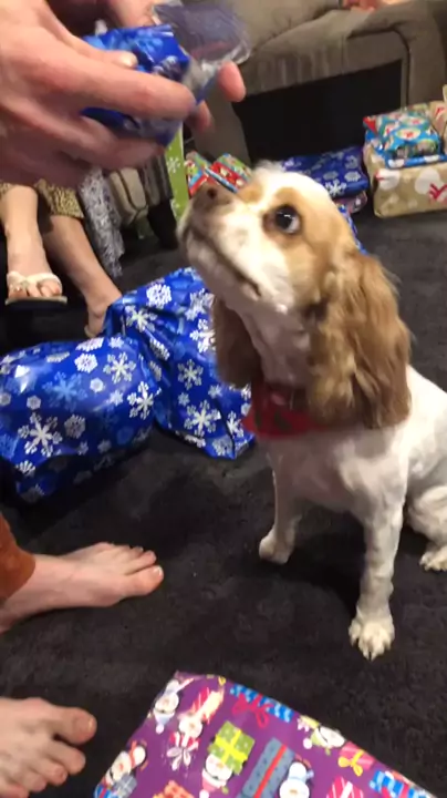 Our dog Daisy opening up a mouse for Christmas 😂 #throwback #Kwaidogs